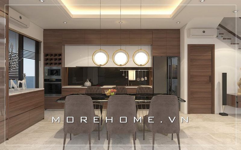 Tâm điểm của nội thất phòng ăn biệt thự, nhà phố là bộ bàn ghế ăn lớn bố trí theo kiểu hiện đại vừa sang trọng lại tiện nghi.