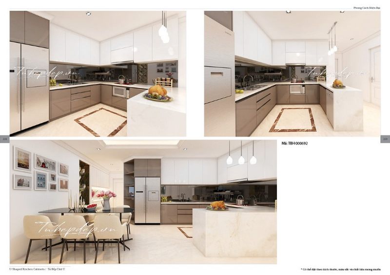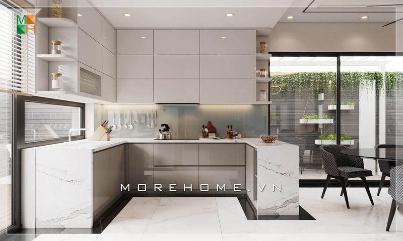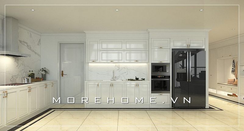 Tủ bếp màu trắng với kiểu dáng thiết kế ấn tượng mang đến sự sang trọng và tinh tế cho không gian bếp ăn của mọi gia đình.