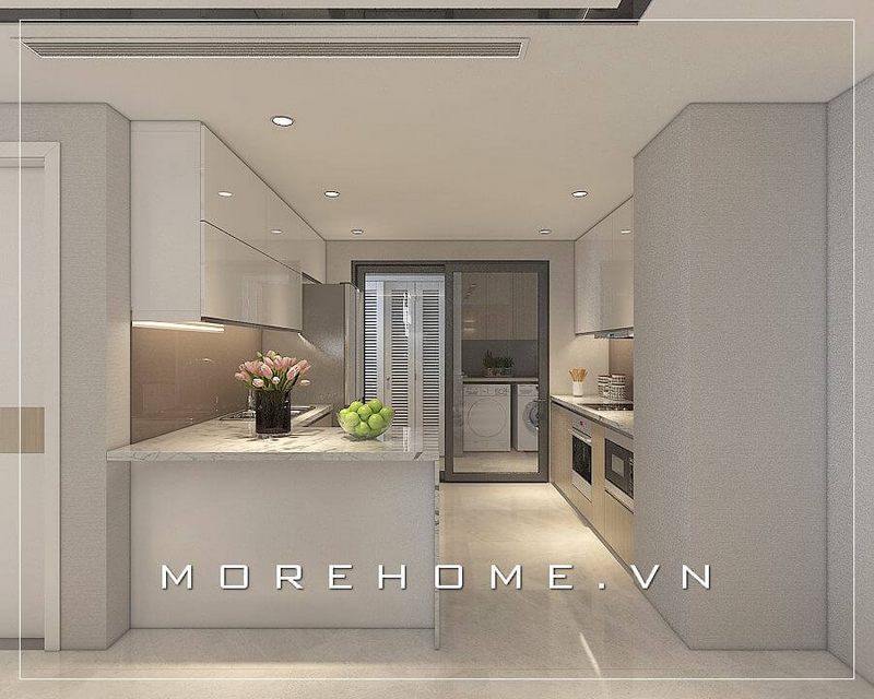 Trang trí chung cư với tủ bếp hiện đại màu trắng, bề mặt bếp được ốp đá nhân tạo cao cấp đảm bảo luôn sang trọng và sạch sẽ