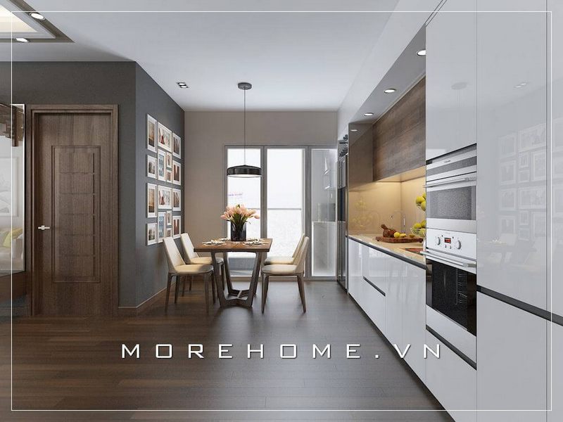 Các kiến trúc sư MoreHome thiết kế phòng bếp hiện đại dành cho chung cư sáng tạo khi sử dụng hiệu ứng tương phản tăng độ rộng từ tủ bếp màu trắng và kính ốp bếp màu đen huyền bí.