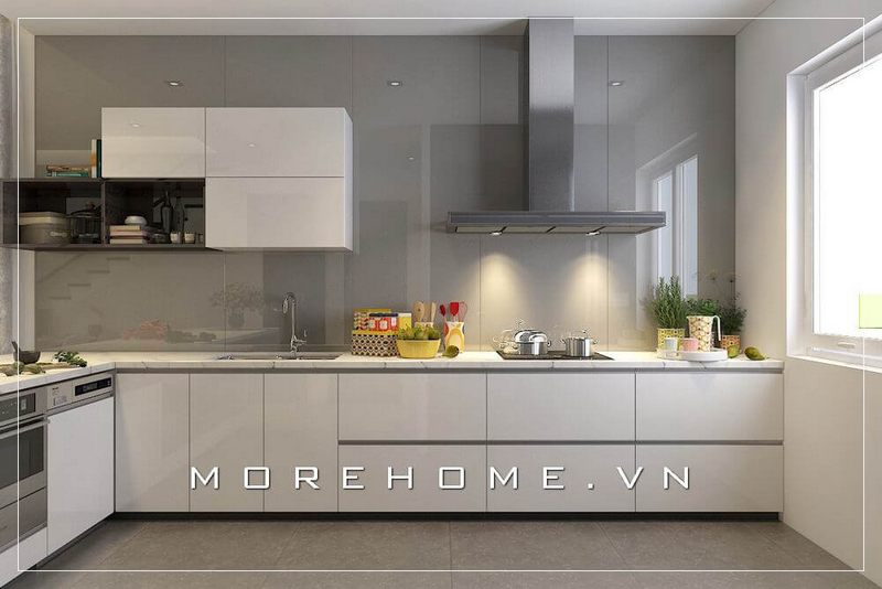 Mẫu tủ bếp gỗ acrylic màu trắng chữ L hiện đại kết hợp thiết bị bếp tiện nghi cho phòng bếp