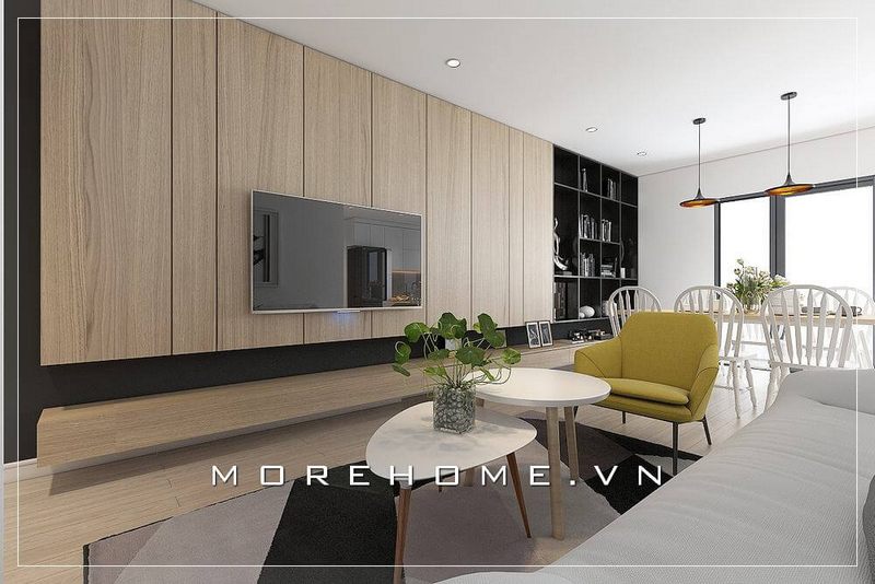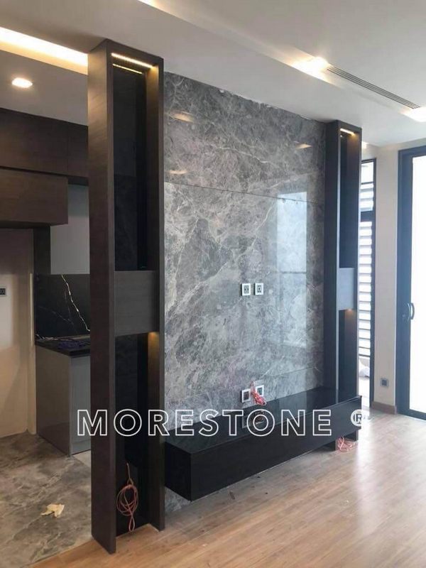 Căn hộ chung cư gây ấn tượng khi sử dụng đá ốp tự nhiên màu xám tinh tế nơi tường phòng khách đẹp hiện đại, độc đáo được Morestone thi công, hoàn thiện.