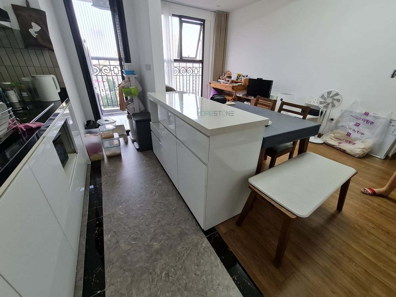 Mẫu đảo bếp mặt đá Himacs màu trắng rất tiện nghi và hiện đại dành cho nhà phố, chung cư, biệt thự.