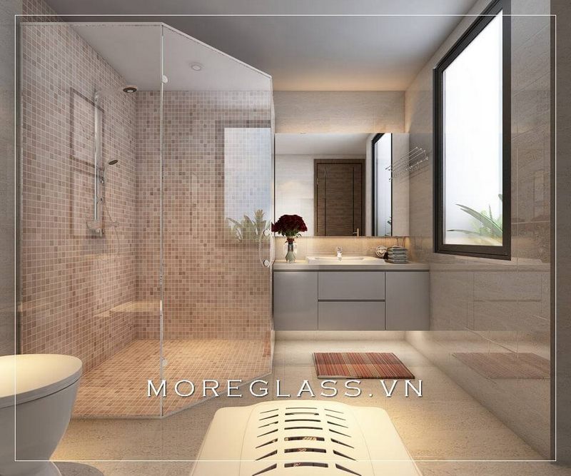 Vách tắm kính đứng 135 độ ngăn không gây văng nước sang khu vực khô trong phòng tránh sự ướt át gây khó chịu.