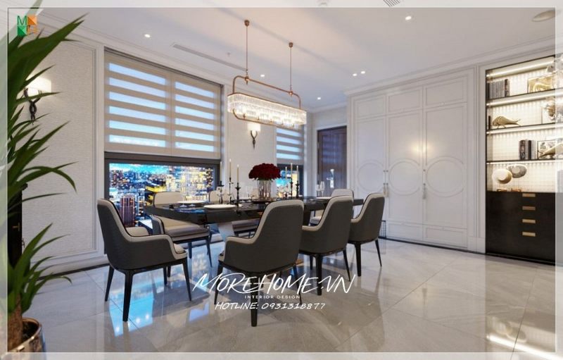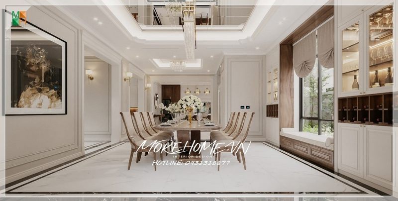 Mẫu thiết kế phòng ăn đậm chất tân cổ điển, với bộ bàn ăn 8 ghế gỗ óc chó tự nhiên, bọc nệm nỉ cao cấp, cùng hệ thống đèn chùm kiểu dáng tinh tế