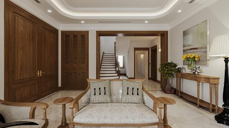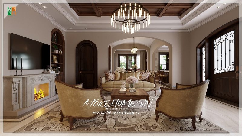 Gỗ óc chó nhập khẩu là chất liệu chủ đạo, được kết hợp với đá ốp tường cao cấp, thảm trải sàn, đèn chùm, kệ tủ, lò sưởi... để tạo nên một không gian phòng khách hoàn mỹ và sang trọng nhất.