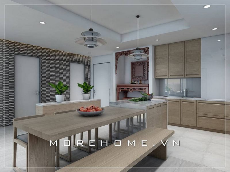 Bàn ăn được thiết kế với màu veneer nâu sữa để phù hợp với phong cách thiết kế của căn nhà và tạo nên sự đẹp mắt.