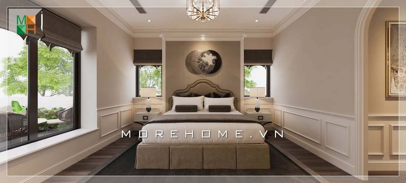 Một mẫu thiết kế phòng ngủ có nhiều cửa sổ thoáng đãng được nổi bật bởi chiếc giường tân cổ điển sắc kem sang trọng.