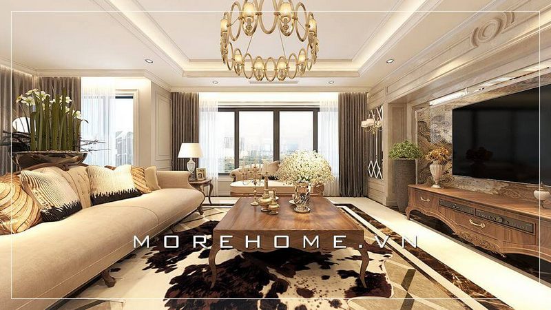 Morehome đã thực hiện việc thi công phòng khách cho biệt thự tại Hà Nội với phong cách tân cổ điển sang trọng.