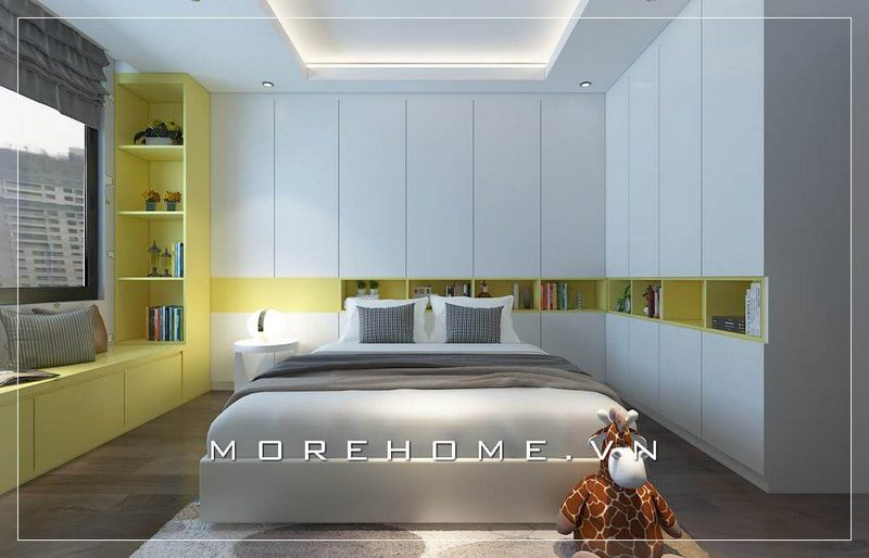 Phòng ngủ trẻ con hiện đại được thiết kế bằng nội thất gỗ công nghiệp màu trắng kết hợp với màu vàng chanh để tạo ra sự ấn tượng hơn.